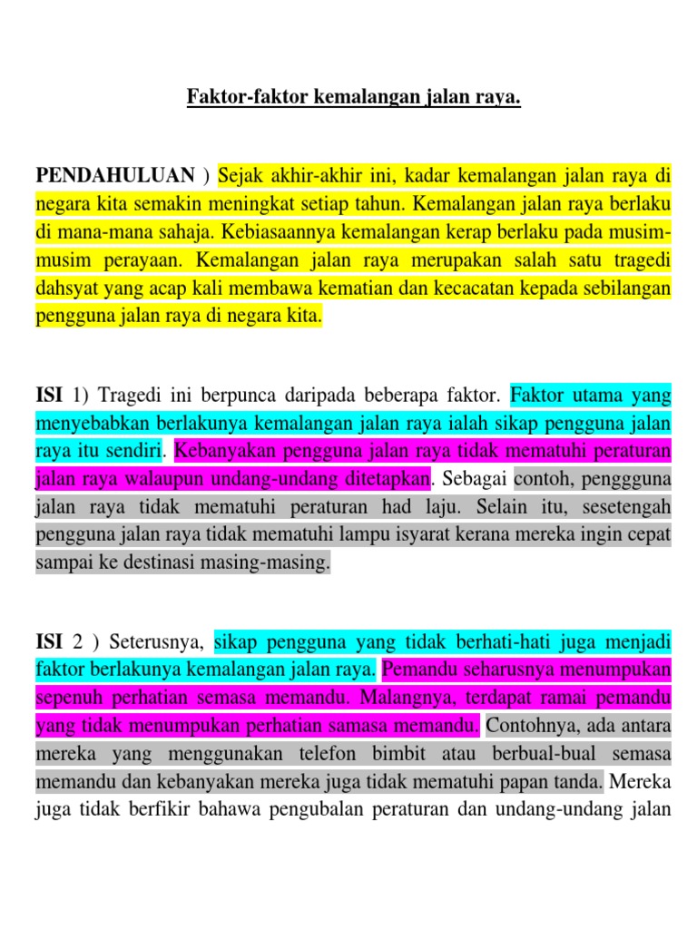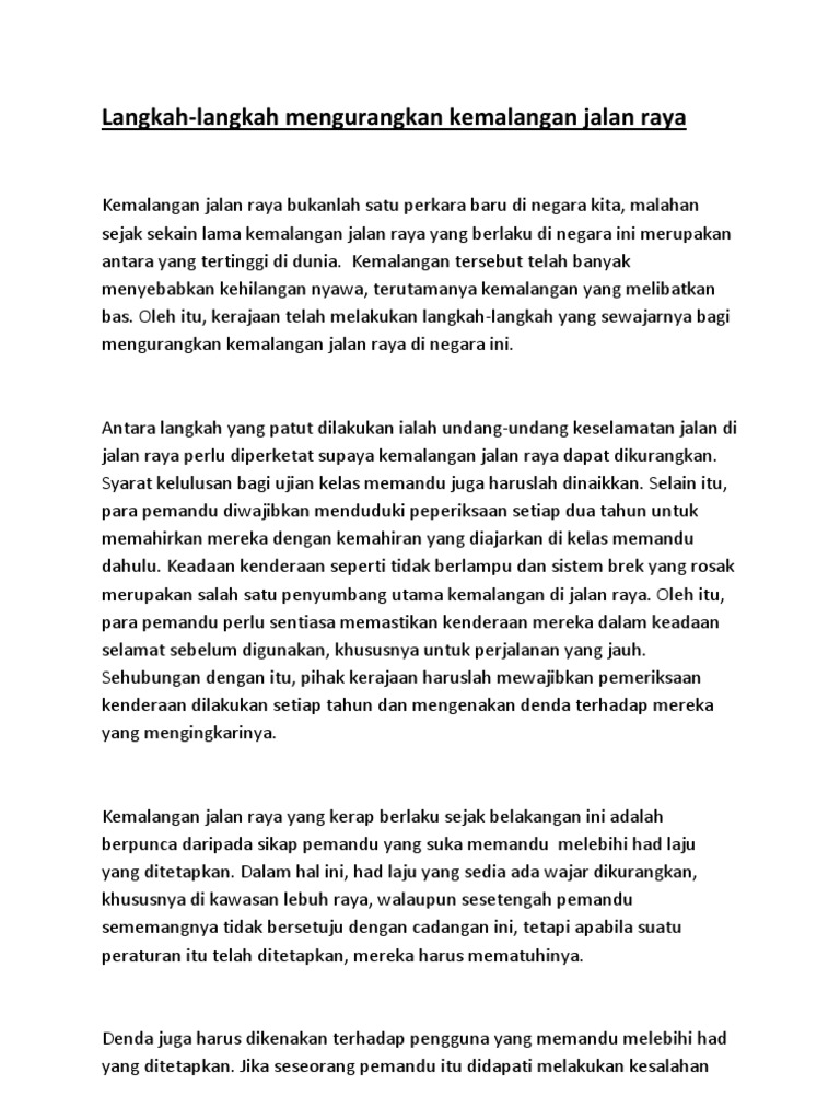 Hakikatnya majoriti dari rakyat Malaysia yang mempunyai kenderaan bermotor masih tidak tahu nilai sebenar cukai. Jika semua pemandu di jalan raya berhemah sudah pasti risiko kemalangan jalan raya dapat dikurangkan. Contoh karangan bahasa inggeris tentang kemalangan jalan.